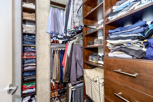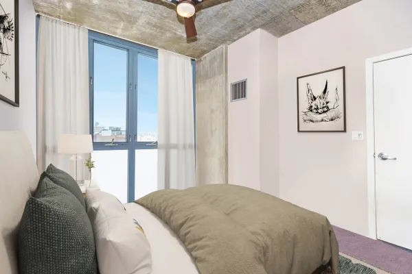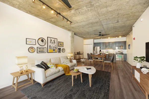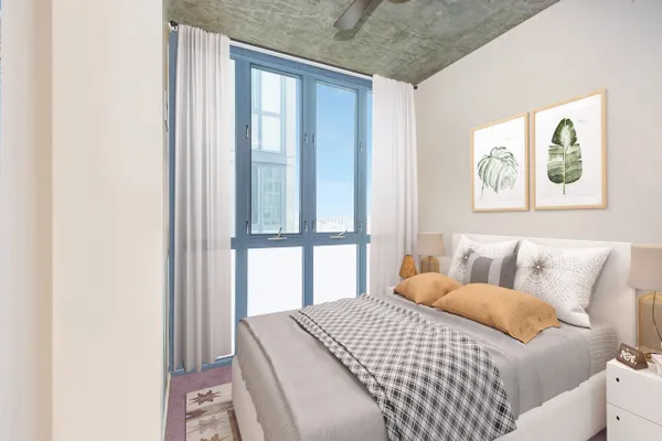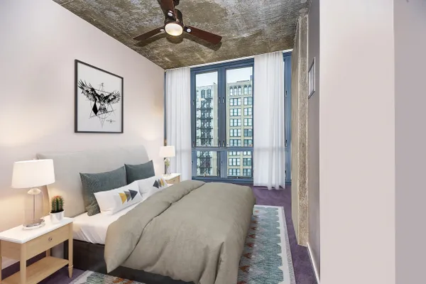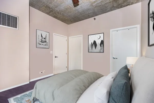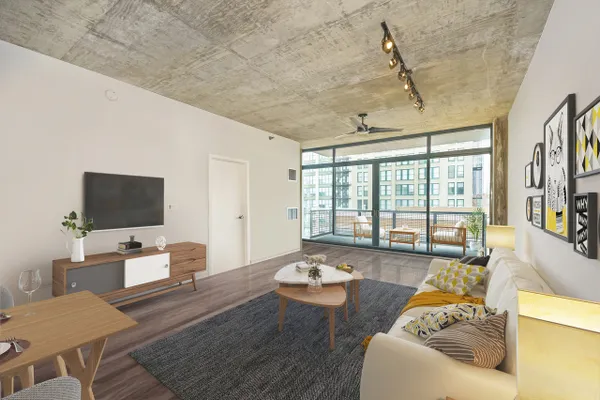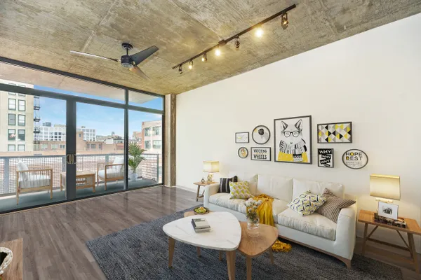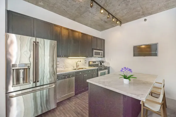 Introducing this spacious & modern end unit in booming West Loop Lofthaus Lofts. Dark espresso floors throughout with open floor plan and solid concrete between floors. Updated marble kitchen with oversized island and space for dining table. Extended living room pours out into oversized balcony with city views through a wall of 10' floor-to-ceiling windows. Both bedrooms are spacious and fully enclosed including master suite w floor-to-ceiling professionally organized walk-in closet. Steps to Park, EL, Loop & Restaurant Row. Easy access to 90/94. Rentals permitted. Deeded Garage Parking $30k. Seller offering paint credit.