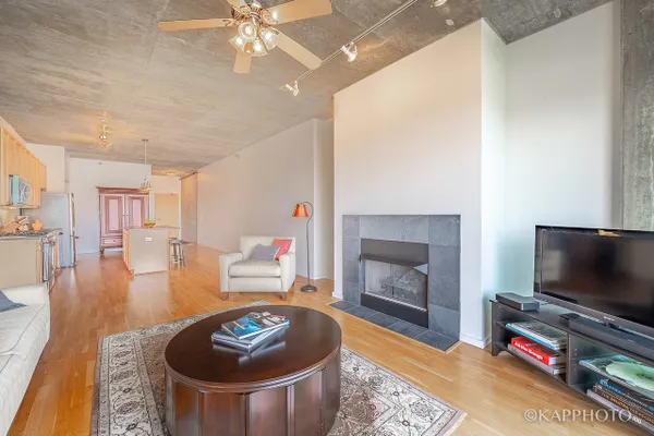 Largest 1 bedroom floorplan in Lofthaus! Jumbo west-facing condo with loft-like 10 ft concrete ceilings, wood flooring, & fireplace. Living area with indoor/outdoor dual-sliding glass doors for those bright sunset views. Stainless steel appliances in the kitchen with an island & pantry closet for extra storage. Bedroom with wall of windows & walk-in closet. Spacious bath with shower/tub combination. All freshly painted. In-unit washer/dryer. Storage locker included. Indoor heated deeded garage space for an additional $25,000. Live in the hottest area of the West Loop! Close to restaurants/retail on Randolph Street, Fulton Market, Whole Foods, Mariano's, Greektown, UIC, & Little Italy. Easy access to transportation & highways.