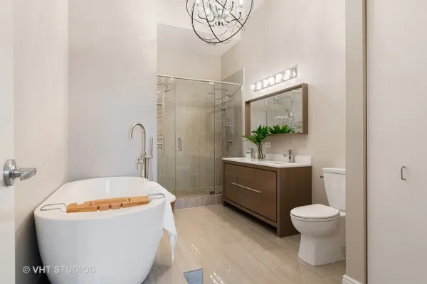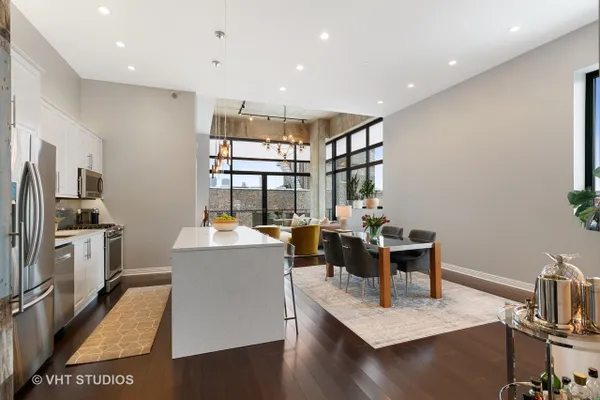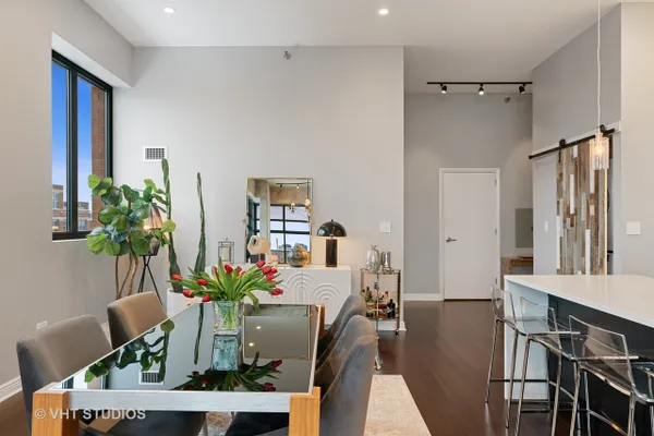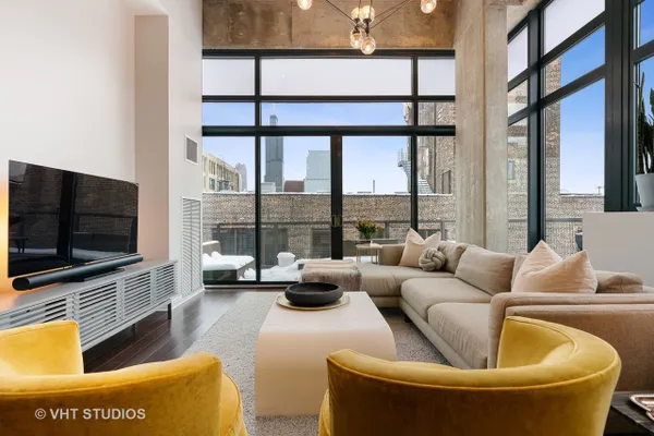 Captivating contemporary penthouse in boutique residential building in sought-after West Loop location. Soaring 16' and 18' ceilings welcome you, a southeast exposure allows for sublime city views and abundant natural light. Expansive sliding double doors onto the wrap around balcony extends the living/entertaining space seamlessly. The gourmet kitchen features upgraded stainless appliances, sleek custom cabinetry, generous storage, quartz counters, a waterfall island and LED ambient lighting under/over cabinetry add smart technology and drama. Split 2 bedrooms, fully enclosed, the primary bedroom offers a tranquil retreat leading to a spa like bath highlighted by a sculptural soaking tub, separate shower with dual sprayers, heated towel rack and double bowl vanity. The wonderfully neutral and elegant Crema Marfil marble complete the spa aesthetic. Abundant storage throughout plus additional storage! Step inside this smart, impeccably designed penthouse residence on Sangamon Street, away from the energetic bustle of the West Loop but in easy walking distance to Mary Bartelme Park, the shops and restaurants of Fulton Market, Randolph Street, the UIC Blue Line stop, Union and Ogilvie Stations and the cool Ground Up Coffee Shop just around the corner. Heated garage parking INCLUDED!